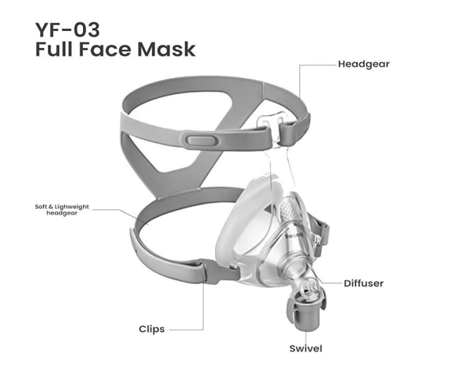 Yuwell BreathWear YF-03 Full Face Mask is a full face mask covering the nose and mouth with the aid of a forehead support.